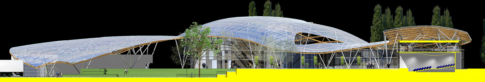 Elle offre un contrepoint formel avec la halle existante du Centre de Recherche.