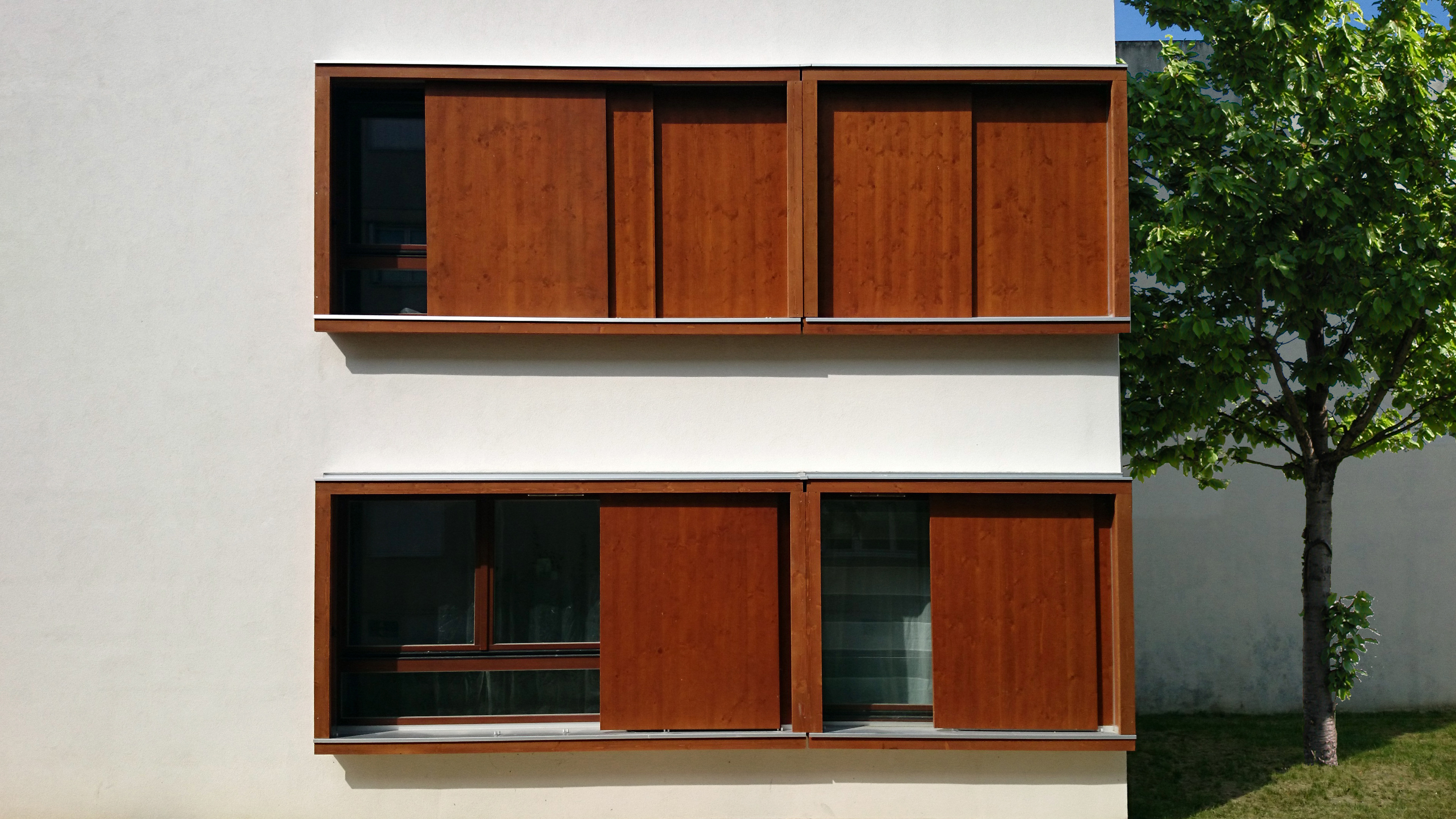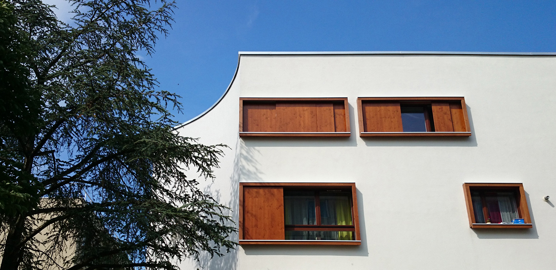 L’écriture architecturale repose sur le dessin particulier des menuiseries bois, dont le cadre épais, en relief, intègre les volets d’occultation. La proportion des ouvertures semble ainsi plus importante, conférant à la résidence, un luxe inhabituel.