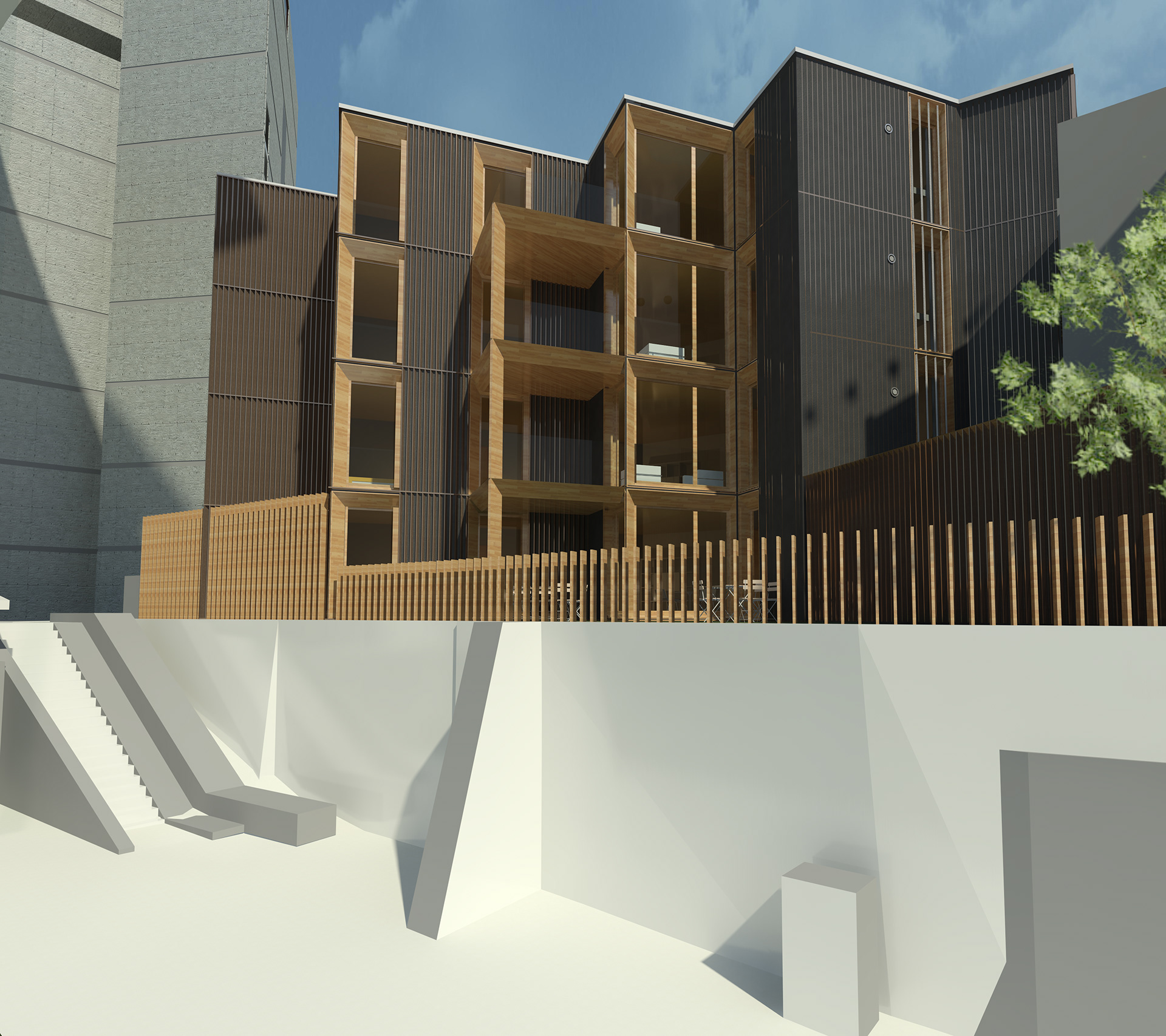Les contraintes de réalisation en site occupé et sans accès depuis le boulevard, ont conduit à une construction à ossature bois pré-fabriquée en usine.