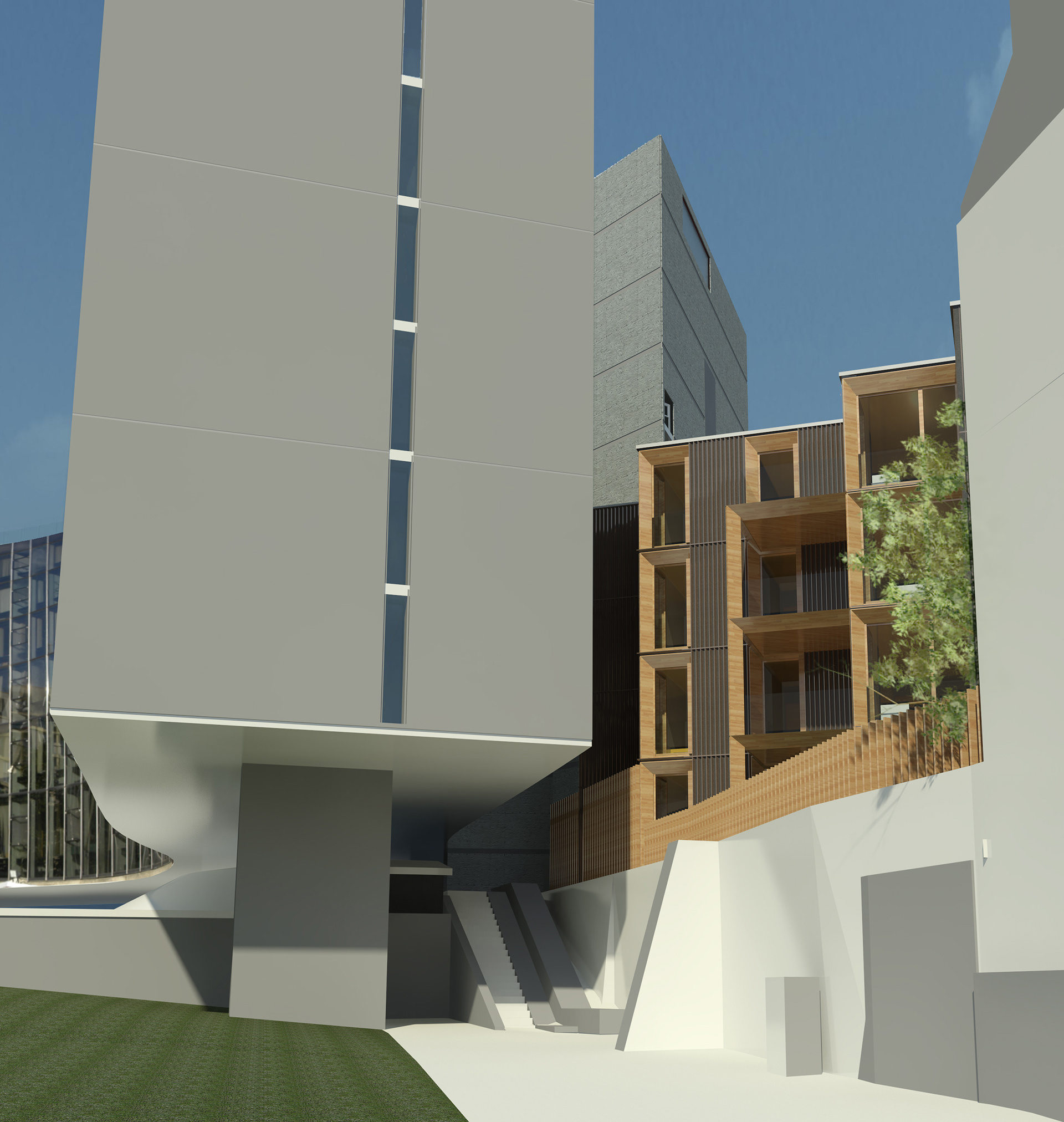 La volumétrie, en redends successifs, est déterminée exclusivement par la nécessité de procurer des vues biaises sans vis à vis, entre les différents volumes dèjà bâtis.